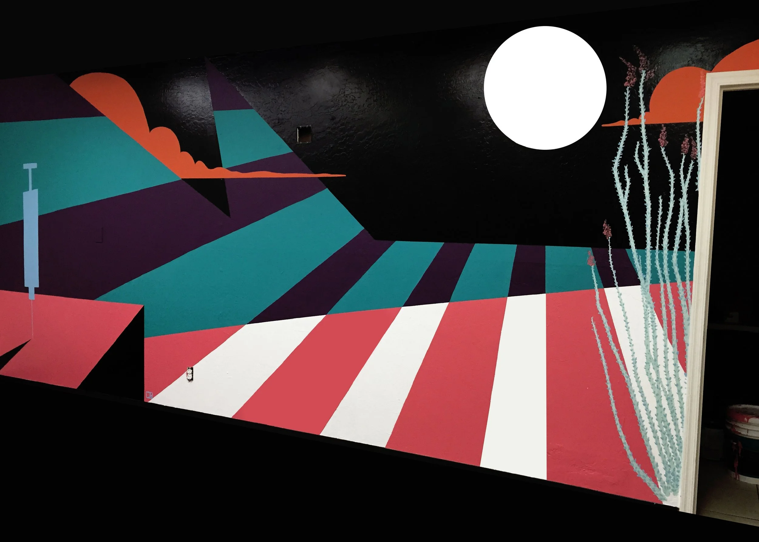 Created for Sonoran Prevention Works, an organization that distributes Naloxone to reverse opioid overdoses and centers harm reduction in the state of Arizona. I juxtaposed plant forms alongside the image of a syringe, creating commentary that the life-saving function of the organization is inherent of the ‘landscape’ of healing. This interior mural honors the labor of frontline harm-reduction workers, softens the clinical environment through color and organic form, and signals to visitors that they are entering a space grounded in care, dignity, and active support rather than judgment.