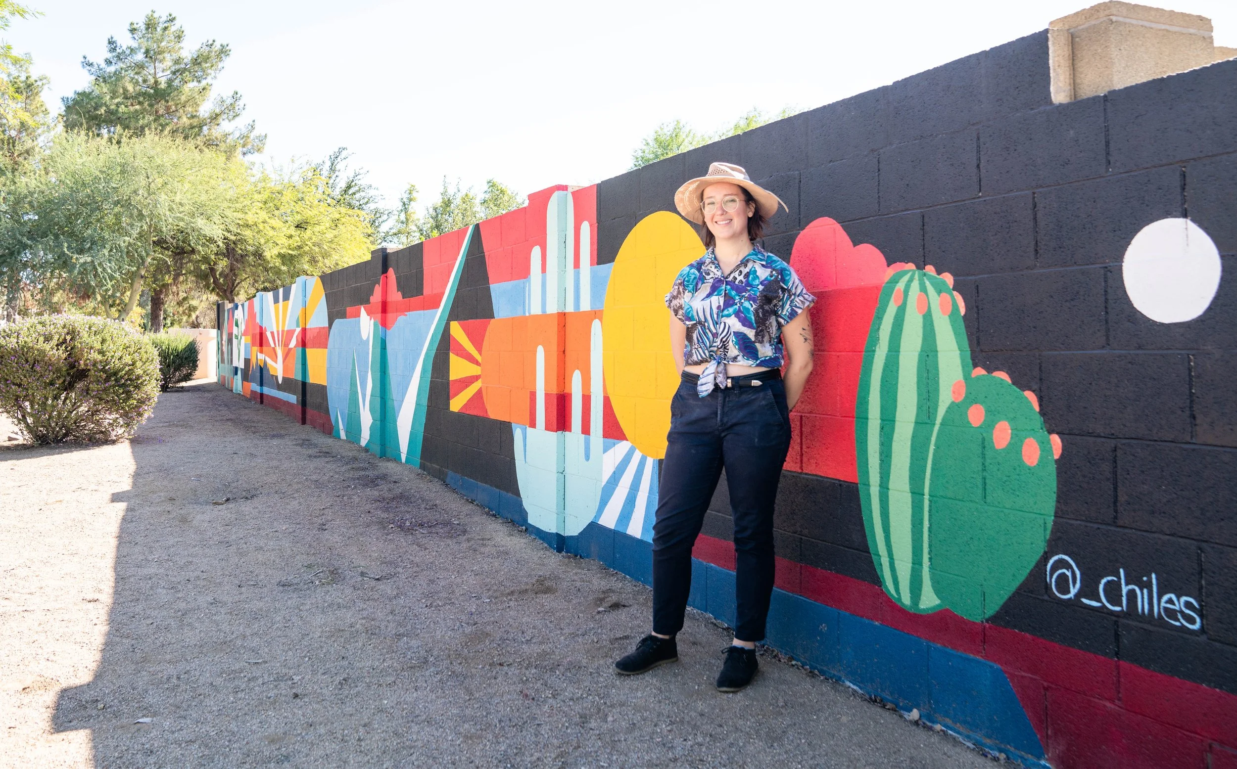The City of Chandler was seeking an artist who would make a mural that was representative of the community it would reside in; as a child I spent much of my time at city parks around the valley and was thrilled to be selected for this opportunity. I organized a public engagement event at the conclusion of the commission that brought the community of Harter Park together to paint terra cotta pots with the leftover paint from the mural and plant seeds together with the parkgoers. The Harter Park Mural captured different day parts of the sonoran landscape; as you walked the length of the 80’ wall, you started at a nighttime desert scene and the imagery slowly changed from sunrise, to early afternoon, to midday to sunset all in the same mural.